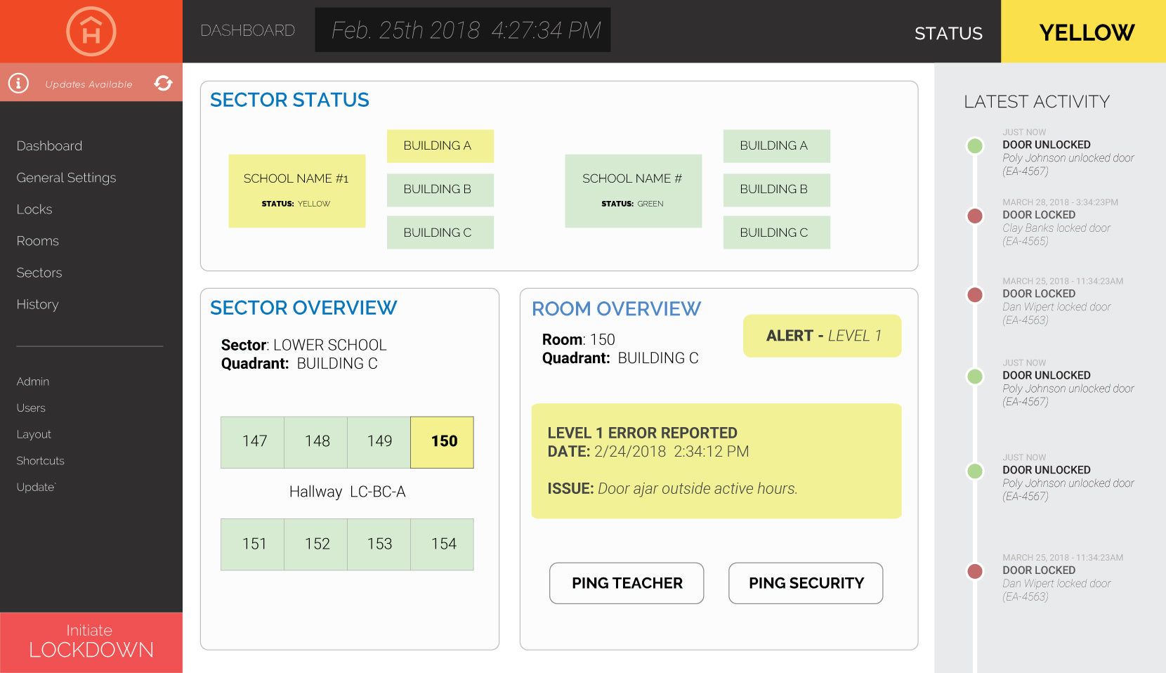 Lockdown Pro HQ is a custom security system for an entire building or school campus. Each room has a lock that is connected to a central hub controlled by administrators.
